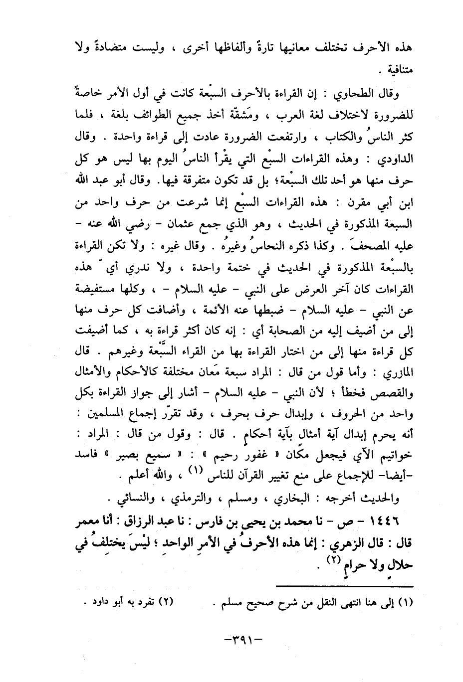 1446- ص- نا محمد بن يحيي بن فارس: نا عبد الرزاق: أنا معمر قال: قال الزهري: إنما هذه الأحرفُ في الأمرِ الواحد , ليْسَ يختلفُ في حلال ولا حرامٍ (2) .