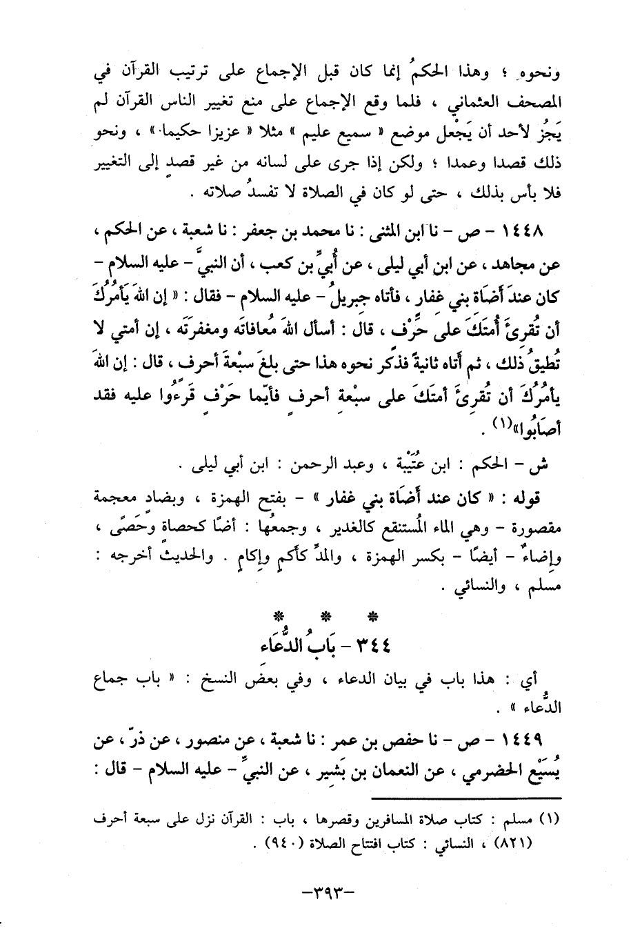 1448- ص- نا ابن المثنى: نا محمد بن جعفر: نا شعبة، عن الحكم، عن مجاهد، عن ابن أبي ليلى، عن أبيِّ بن كعب، أن النبيّ- عليه السلام- كان عند أضاة بني غفارِ، فأتاه جبريلُ- عليه السلام- فقال: " إن الله يأمُرُك أن تُقرِئ أمتكً على حرْف، قال: أسأل الله مُعافاته ومغفرته، إن أمتي لا تُطيقُ ذلك، ثم أتاه ثانية فذكر نحوه هذا حتى بلغ سبْعة أحرف، قال: إن الله يأمُرُك أن تُقرِئ أمتك على سبْعة أحرف فأيّما حرْف قرءُوا عليه فقد أصابُوا " (1) .
