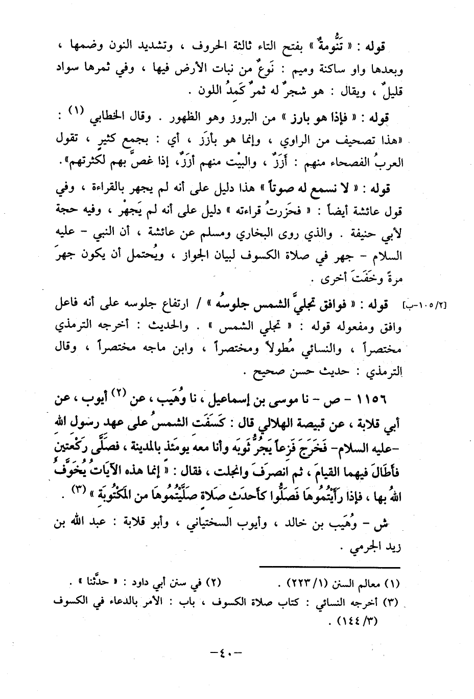 1156- ص- نا موسى بن إسماعيل، لا وُهَيب، عن (2) أيوب، عن أبي صلابة، عن قبيلة الهلالي قال: كَسَفَتِ الشمسي على عهد رسولِ الله - عليه السلام- فَخَرَجَ فزعا يَجُرُّ ثَوبَه وأنا معه يومَئذ بالمدينة، فصًلى رَكْعتين فأطَالَ فيهما القيام، ثم انصرَفَ وانجلت، فقال: "إنما هذه الآياتُ يُخَوف اللهُ بها، فإذا رَأيْتُمُوهَا فَصَلوا كأحدَث صَلاة صَلَيْتُمُوهَا من المَكْتُوبَةِ " (3) .ش- وُهَيب بن خالد، وأيوب السختياني، وأبو صلابة: عبد الله بن زيد الجرمي.