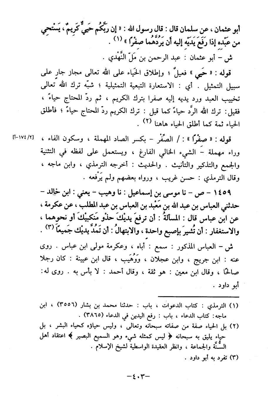 (2) بل الحياء صفة من صفاته سبحانه وتعالى، وليس حياؤه كحياء البشر، بل حياء يليق به سبحانه (ليس كمثله شيء وهو السميع البصير) اعتقاد أهل السّنة والجماعة، وانظر العقيدة الواسطية لشيخ الإسلام.