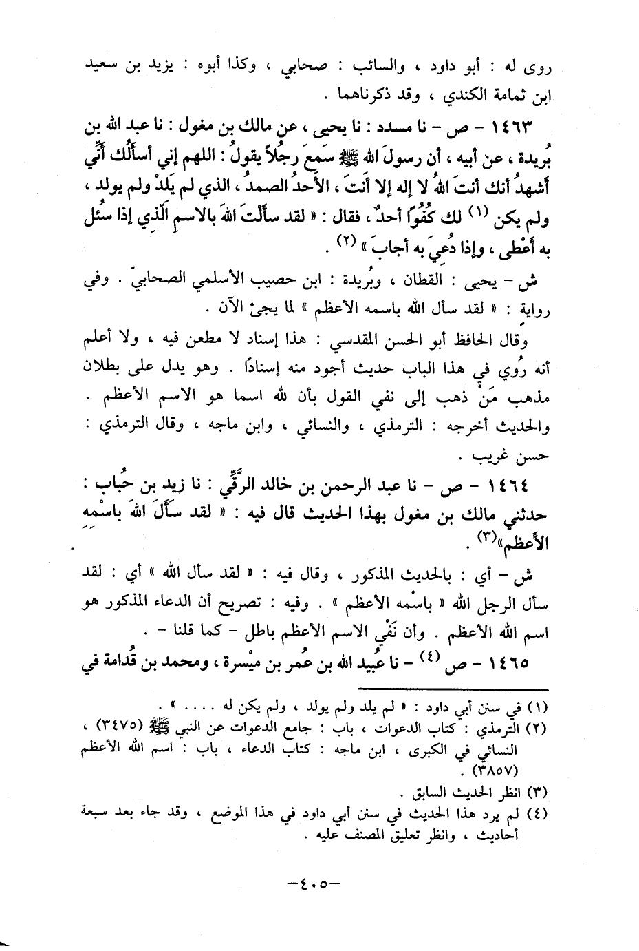 1464- ص- نا عبد الرحمن بن خالد الرّقِّي: نا زيد بن حُباب: حدثني مالك بن مغول بهذا الحديث قال فيه: " لقد سأل الله باسْمه الأعظم " (3) . ش- أي: بالحديث المذكور، وقال فيه: " لقد سأل الله " أي: لقد سأل الرجل الله " باسْمه الأعظم،. وفيه: تصريح أن الدعاء المذكور هو اسم الله الأعظم. وأن نفْي الاسم الأعظم باطل- كما قلنا-.