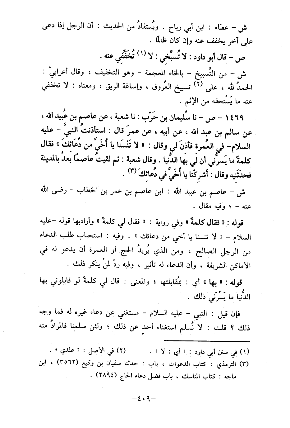 1469- ص- نا سُليمان بن حرْب: نا شعبة، عن عاصم بن عُبيد الله، عن سالم بن عبد الله، عن أبيه، عن عمر قال: استأذنتُ النبيّ- عليه السلام- في العُمرة فأذن لي وقال: " لا تنْسنا يا أخيّ من دُعائِك " فقال كلمةً ما يسرُّني أن لي بها الدُّنيا. وقال شعبة: ثم لقيتُ عاصمًا بعدُ بالمدينة فحدّثنِيه وقال: أشرِكْنا يا أخي في دُعائِك (3) .