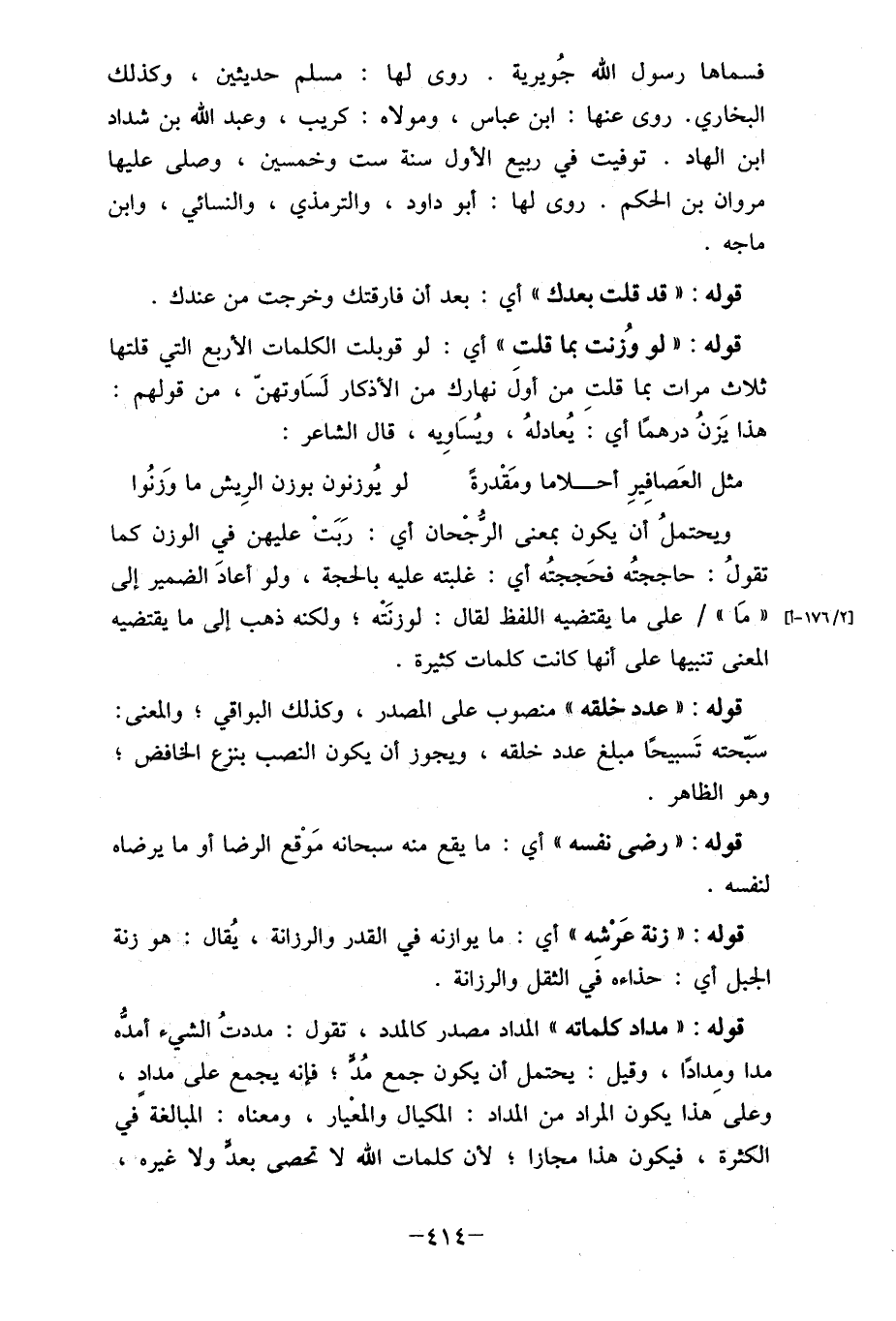 قوله: " مداد كلماته، المداد مصدر كالمدد، تقول: مددتُ الشيء أمدُه مدا ومدادًا، وقيل: يحتمل أن يكون جمع مُذ , فإنه يجمع على مداد، وعلى هذا يكون المراد من المداد: المكيال والمعْيار، ومعناه: المبالغة في الكثرة، فيكون هذا مجازا , لأن كلمات الله لا تحصى بعد ولا غيره،