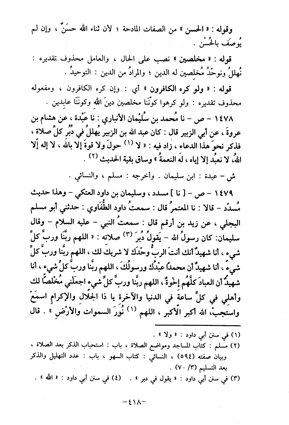 1479- ص-[نا] مسدد، وسليمان بن داود العتكي- وهذا حديث مُسدد- قالا: نا المعتمرُ قال: سمعتُ داود الطُّفاوي: حدثني أبو مسلم البجلي، عن زيد بن أرقم قال: سمعتُ النبي- عليه السلام- وقال سليمان: كان رسولُ الله- يقولُ دبر (3) صلاته: " اللهم ربّنا ورب كلِّ شيء، أنا شهيدٌ أنك أنت الربُّ وحْدك لا شريك لك، اللهمِ ربّنا وربّ كل شيءً، أنا شهيدٌ أن محمد عبْدُك ورسولُك، اللهم ربّنا ورب كلِّ شيء، أنا شهيد أن العباد كلّهُم إِخْوة، اللهم ربنا وربّ كلِّ شيء اجعلني مُخْلصًا لك وأهلِي في كلِّ ساعة في الدنيا والآخرة يا ذا الجلال والإكرام اسمعْ واستجبْ، الله كبر الأكبر، اللهم (1) نُور السموات والأرْضِ ". قال