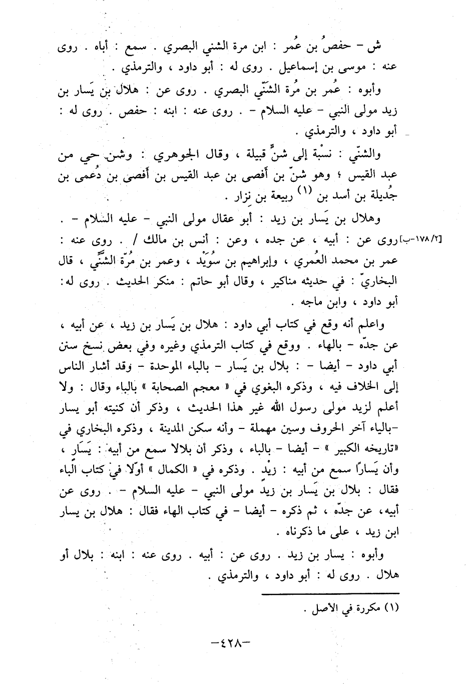 واعلم أنه وقع في كتاب أبي داود: هلال بن يسار بن زيد، عن أبيه، عن جدّه- بالهاء. ووقع في كتاب الترمذي وغيره وفي بعض بنسخ سنن أبي داود- أيضا-: بلال بن يسار- بالباء الموحدة- وقد أشار الناس إلى الخلاف فيه، وذكره البغوي في " معجم الصحابة " بالباء وقال: ولا أعلم لزيد مولى رسول الله غير هذا الحديث، وذكر أن كنيته أبو يسار - بالياء آخر الحروف وسين مهملة- وأنه سكن المدينة، وذكره البخاري في "تاريخه الكبير"- أيضا- بالباء، وذكر أن بلالا سمع من أبيه: يسار، وأن يسارًا سمع من أبيه: زيْدٍ. وذكره في " الكمال " أوّلا- فيه كتاب الباء فقال: بلال بن يسار بن زيد مولى النبي- عليه السلام-. روى عن أبيه، عن علىّ، ثم ذكره- أيضا- في كتاب الهاء فقال: هلال بن يسار ابن زيد، على ما ذكرناه.
