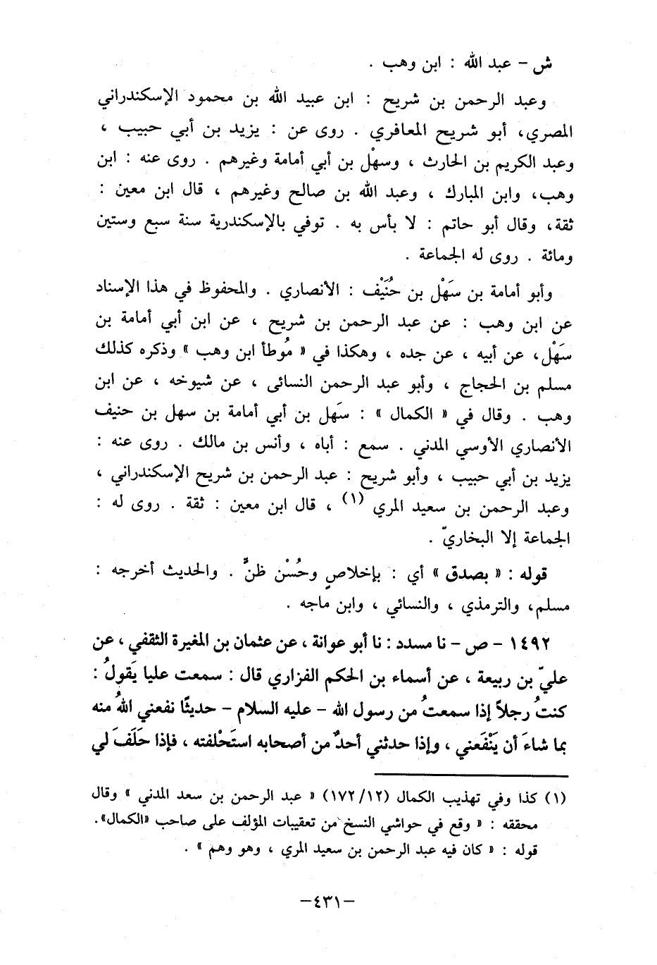 وأبو أمامة بن سهْل بن حُنيْف: الأنصاري. والمحفوظ في هذا الإسناد عن ابن وهب , عن عبد الرحمن بن شريح، عن ابن أبي أمامة بن سهْل، عن أبيه، عن جده، وهكذا في " مُوطأ ابن وهب " وذكره كذلك مسلم بن الحجاج، وأبو عبد الرحمن النسائي، عن شيوخه، عن ابن وهب. وقال في " الكمال ": سهل بن أبي أمامة بن سهل بن حنيف الأنصاري الأوسي المدني. سمع: أباه، وأنس بن مالك. روى عنه: يزيد بن أبي حبيب، وأبو شريح: عبد الرحمن بن شريح الإسكندراني، وعبد الرحمن بن سعيد المري (1) ، قال ابن معين: ثقة. روى له: الجماعة إلا البخاري.
