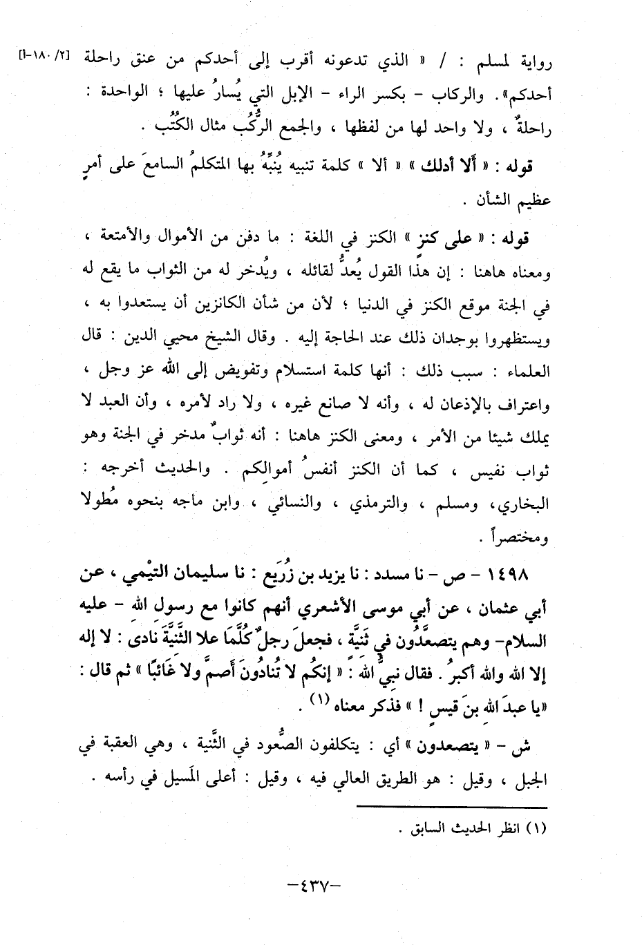 1498- ص- نا مسدد: نا يزيد بن زُريع: نا سليمان التيْمي، عن أبي عثمان، عن أبي موسى الأشعري أنهم كانوا مع رسول اللهِ- عليه السلام- وهم يتصعّدُون في ثنيّة، فجعل رجلٌ كلما علا الثنيّة نادى: لا إله إلا الله والله كبرُ. فقال نبي الله: " إنكُم لا تُنادون أصمّ ولا غًائبا " ثم قال: "يا عبد اللهِ بن قيسٍ " " فذكر معناه (1) .