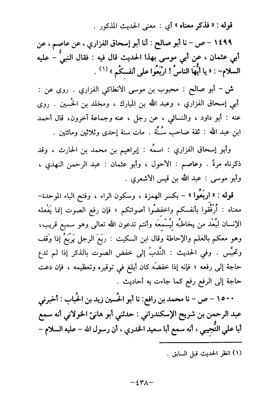 1499- ص- نا أبو صالح: أنا ألو إسحاق الفزاري، عن عاصم، عن أبي عثمان، عن أبي موسى بهذا الحديث قال فيه: فقال النبي- عليه السلام-: " يا أيها "يأيها الناس! أرْبعُوا على أنفسِكُم " (1) .