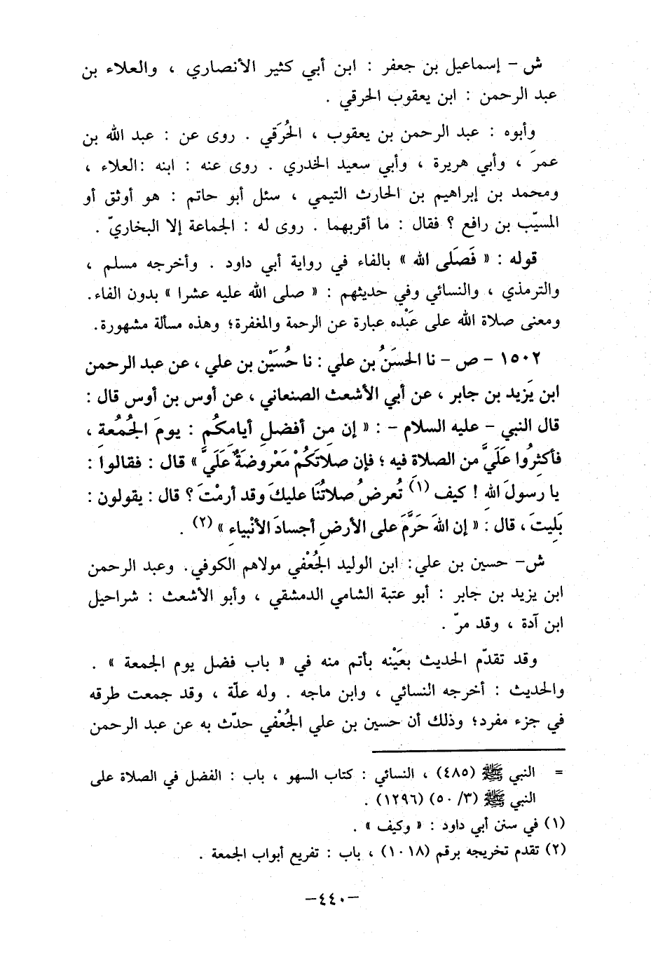 وأبوه: عبد الرحمن بن يعقوب، الحُرقي. روى عن: عبد الله بن عمر، وأبي هريرة، وأبي سعيد الخدري. روى عنه: ابنه: العلاء، ومحمد بن إبراهيم بن الحارث التيمي، سئل أبو حاتم: هو أوثق أو المسيب بن رافع؟ فقال: ما أقربهما. روى له: الجماعة إلا البخاري. قوله: " فصلى الله " بالفاء في رواية أبي داود. وأخرجه مسلم، والترمذي، والنسائي وفي حديثهم: " صلى الله عليه عشرا، بدون الفاء. ومعنى صلاة الله على عبْده عبارة عن الرحمة والمغفرة , وهذه مسألة مشهورة. 1502- ص- نا الحسنُ بن علي: نا حُسيْن بن علي، عن عبد الرحمن ابن يزيد بن جابر، عن أبي الأشعث الصنعاني، عن أوس بن أوس قال: قال النبي- عليه السلام-: " إن مِن أفضلِ أيامكُم: يوم الجُمُعة، فأكثِرُوا عليّ من الصلاة فيه؟ فإن صلاتكُمْ معْروضة عًليّ " قال: فقالوا: يا رسول الله " كيف (1) تُعرضُ صلاتُنا عليك وقد أرمْت؟ قال: يقولون: بلِيت، قال. " إن الله حرم على الأرضِ أجساد الأنْبياءِ " (2) .