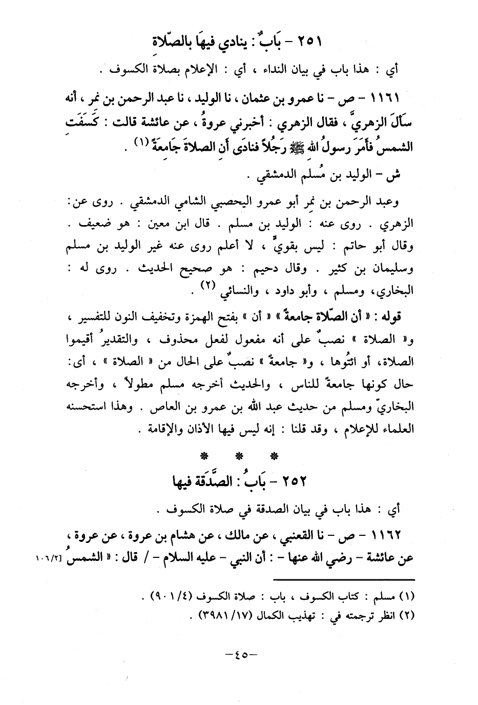 سَألَ الزهريَ، فقال الزهري: أخبرني عروةُ، عن عائشة قالت: كَسَفَت الشمسُ فأمرَ رسولُ اللهِ صلى الله عليه وسلم جميع رَجُلاً فناسَ أنه الصلاةَ جَامِعَةً (1) .