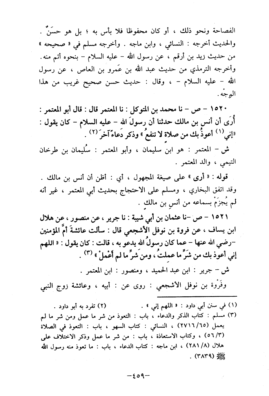 1521- ص- نا عثمان بن أبي شيبة: نا جرير، عن منصور، عن هلال ابن يساف، عن فروة بن نوفل الأشجعي قال: سألت عائشة أم المؤمنين - رضي الله عنها- عما كان رسولُ الله يدعو به، قالت: كان يقول: لا اللهم إني أعوذ بك من شرِّ ما عمِلتُ، ومن شرِّ ما لم أعْملْ، (3) .