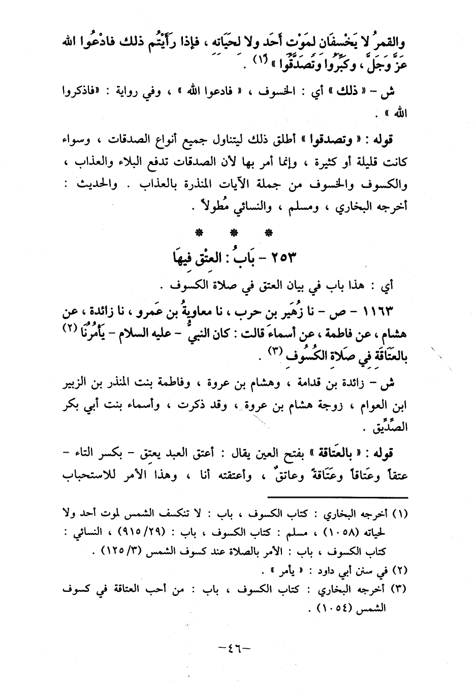 1163- ص- نا زُهَير بن حرب، نا معاويةُ بن عَمرو، نا زائدة، عن هشام، عن فاطمة، عن أسماءَ قالت: كان النبي- عليه السلام- يأمُرُنَا (2) بالعَتَاقَةِ فِي صَلاةِ الكُسُوفِ (3) .