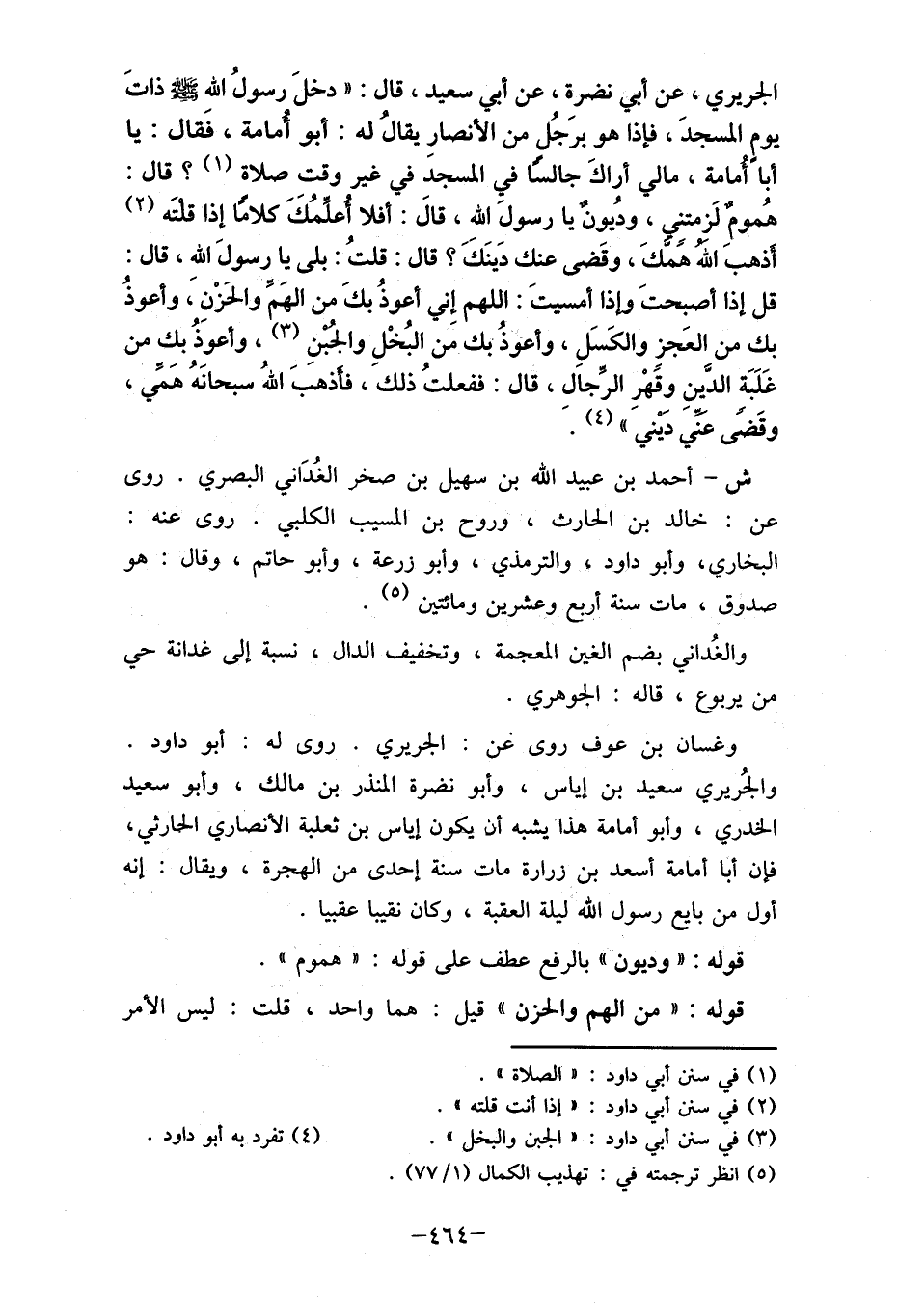 الجريري، عن أبي نضرة، عن أبي سعيد، قال: " دخل رسولُ الله صَلَّى اللَّهُ عَلَيْهِ وَسَلَّمَ يومِ المسجد، فإذا هو برجُل من الأنصار يقالُ له: أبو أمامة، فقال: يا أبا أمامة، مالي أراك جالسا في المسجد في غير وقت صلاة (1) ؟ قال: هُموم لزمتني، ودُيون يا رسول الله، قال: أفلا أعلِّمُك كلاما إذا قلته (2) أذهب الله همّك، وقضى عنك دينك؟ قال: قلتُ: بلى يا رسول اللهِ، قال: قل إذا أصبحت وإذا أمسيت: اللهم إني أعوذُ بك من الهمِّ والحزْنِ، وأعوذُ بك من العجزِ والكسلِ، وأعوذُ بك من البُخْلِ والجبنِ (3) ، وأعوذُ بك من غلبة الدّينِ وقهْرِ الرِّجالِ، قال: ففعلتُ ذلك، فأذهب اللهُ سبحانهُ همِّي، وقضُى عنِّي ديْني " (4) .