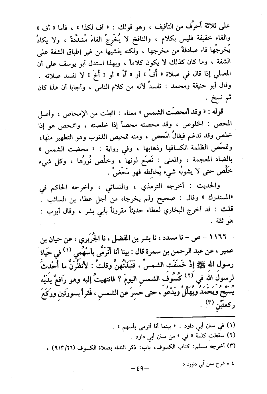 1166- ص- نا مسدد، نا بشر بن المفضل، نا الجُرَيري، عن حيان بن عمير، عن عبد الرحمن بن سمرة قال: بينا أنا أتَرَفَى بأسْهُمِي (1) في حياة رسول الله صلى الله عليه وسلم إذا خَسَفَت الشمسُ، فَنَبَذتُهن وقلتُ: لأنظُرَن ما أحْدِثَ لرسولَ اللهِ في (2) كُسُوفِ الشمسِ اليومَ؟ فانتهيتُ إليه وهو رَافع يدَيْه يُسبحُ ويَحْمَدُ ويُهَللُ ويدْعُو، حتى حسرة عن الشمس، فَقرأ بسورَتين ورَكعً ركعتينِ (3) .ً