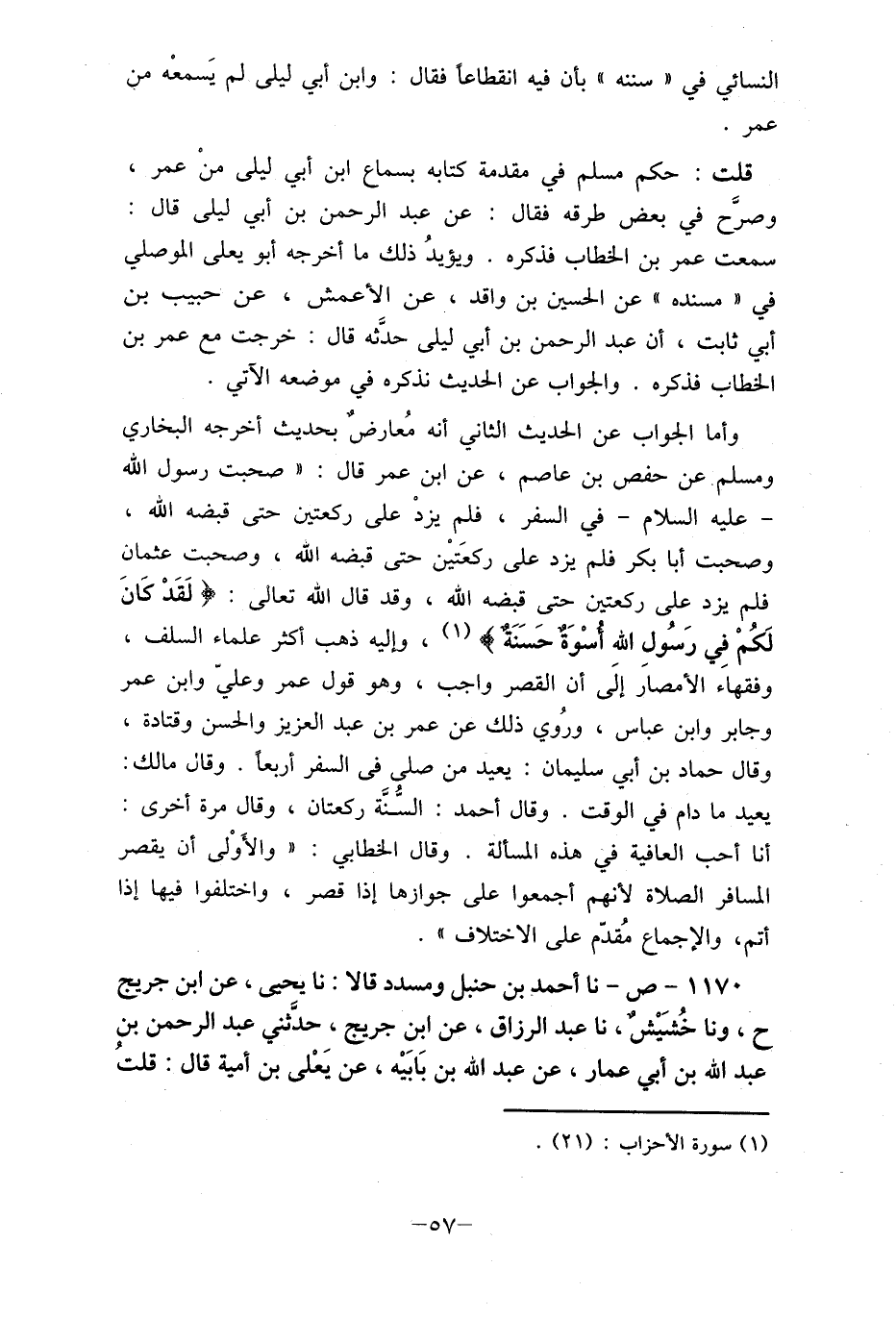 قلت: حكم مسلم في مقدمة كتابه بسماع ابن أبي ليلى منْ عمر، وصرَّح في بعض طرقه فقال: عن عبد الرحمن بن أبي ليلى قال: سمعت عمر بن الخطاب فذكره. ويؤيدُ ذلك ما أخرجه أبو يعلى الموصلي في " مسنده " عن الحسن بن واقد، عن الأعمش، عن حبيب بن أبي ثابت، أن عبد الرحمن بن أبي ليلى حدَّثه قال: حْرجت مع عمر بن الخطاب فذكره. والجواب عن الحديث نذكره في موضعه الآتي.