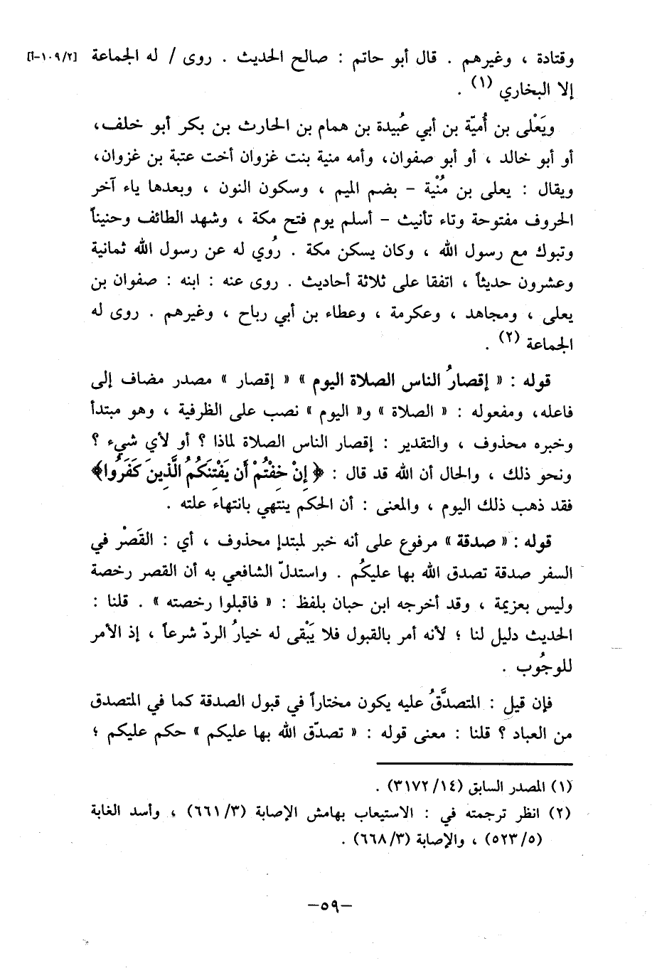 قوله: "إقصارُ الناس الصلاة اليوم " " إقصار " مصدر مضاف إلى فاعله، ومفعوله: " الصلاة " و" اليوم " نصب على الظرفية، وهو مبتدأ وخبره محذوف، والتقدير: إقصار الناس الصلاة لماذا؟ أو لأيِ شيء؟ ونحو ذلك، والحال أن الله قد قال: {أنْ خِفْتُمْ أن يَفْتنَكُمُ الذِين كَفَروا} فقد ذهب ذلك اليوم، والمعنى: أن الحكم ينتهي بانتهاءَ علته.