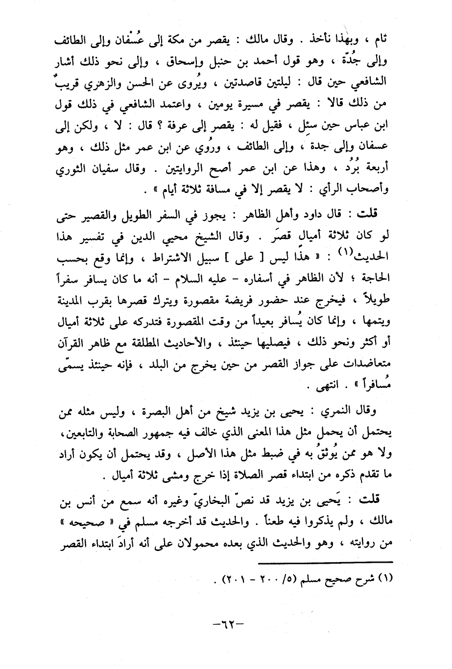 لو كان ثلاثة أميالٍ قصَر. وقال الشيخ محيي الدين في تفسير هذا الحديث (1) : " هذا ليس [على] سبيل الاشتراط، وإنما وقع بحسب الحاجة , لأن الظاهر في أسفاره - عليه السلام - أنه ما كان يسافر سفرا طويلاً، فيخرج عند حضور فريضة مقصورة ويترك قصرها بقرب المدينة ويتمها، وإنما كان يُسافر بعيدا من وقت المقصورة فتدركه على ثلاثة أميال أو أكثر ونحو ذلك، فيصليها حينئذ، والأحاديث المطلقة مع ظاهر القرآن متعاضدان على جواز القصر من حين يخرج من البلد، فإنه حينئذ يسعى مسافرا " انتهي.