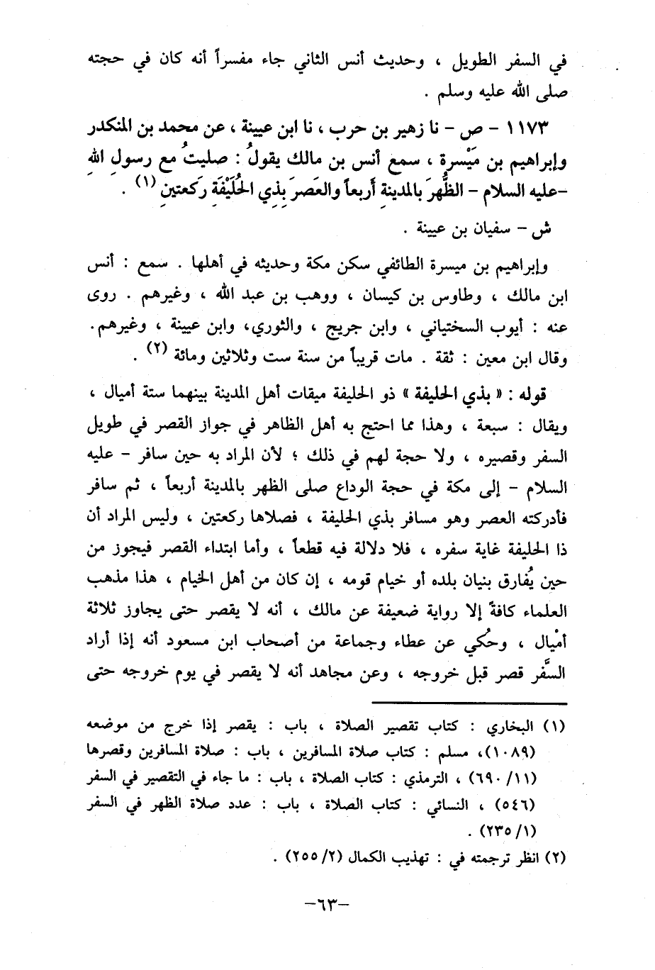 1173- ص- نا زهير بن حرب، نا ابن عيينة، عن محمد بن المنكدر وإبراهيم بن مَيْسرة، سمع أنس بن مالك يقولُ: صليتُ مع رسولِ الله "عليه السلام- الظُّهرَ بالمدينةِ أربعا والعَصرَ بِذِي الحُلَيْفَةِ رَكعتينِ (1) .