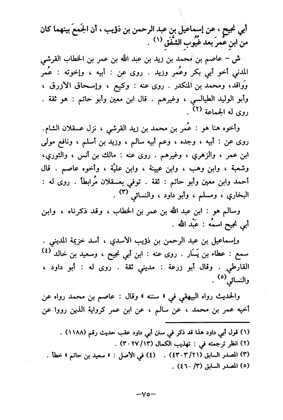 أبي نجيع، عن إسماعيل بن عبد الرحمن بن ذؤيب، أن الجَمعَ بينهما كان من ابنِ عمرَ بعد غُيُوبِ الشفَقِ (1) .