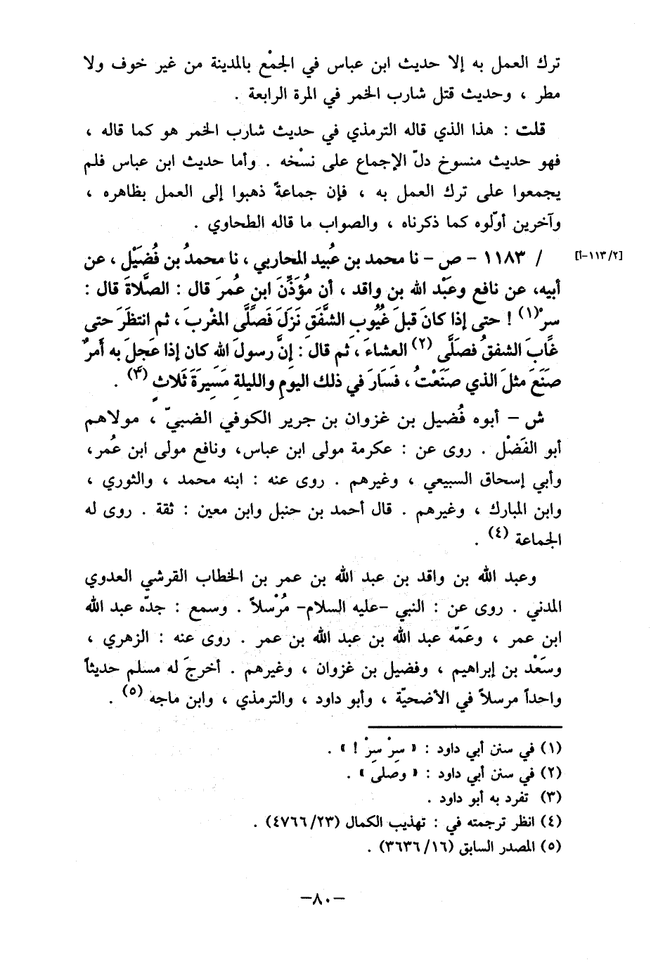 [2/ 113 - أ] / 1183- ص- نا محمد بن عُبيد المحاربي، نا محمدُ بن فُضَيْل، عن أبي عن نافع وعَبْد الله بن واقد، أن مُؤِذنَ ابنِ عُمرَ قال: الصلاةَ قال: سرْ (1) ! حتى إذا كانَ قبلَ غُيُوب الشفَق نزَلَ فَصَلَّى المغْربَ، ثم انتظَرَ حتى كًابَ الشفقُ فصلى (2) العشاءَ، َ ثم قالَ: إِن رسولَ الله كان إذا عَجلَ به أمر صَنعً مثلَ الذي صَنَعْتُ، فسًارَ في ذلك اليوم والليلةِ مَسِيرَةَ ثَلاث (3) . ش- أبوه فُضيل بن غزوان بن جرير الكوفي الضبي، مولاهم أبو الفَضْل. روى عن: عكرمة مولى ابن عباس، ونافع مولى ابن عُمر، وأبي إسحاق السبيعي، وغيرهم. روى عنه: ابنه محمد، والثوري، وابن المبارك، وغيرهم. قال أحمد بن حنبل وابن معين: ثقة. روى له الجماعة (4) .