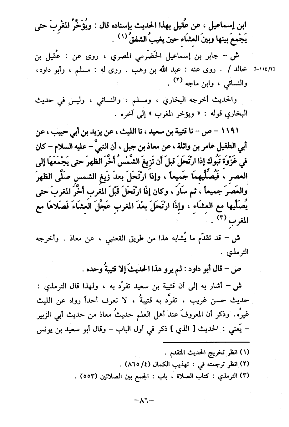 1191- ص- نا قتيبة بن سعيد، نا الليث، عن يزيد بن أبي حبيب، عن أي الطفيل عامر بن واثلة، عن معاذ بن جبل، أن النبيَّ- عليه السلام- كان في غَزْوَة تَبُوك إذا ارْتَحَلَ قبلَ أَن تَزِيغَ الشَّمْسُ أخَّرِ الظهرَ حتى يَجْمَعَهَا إلى العصرِ، فيصليها جَميعا، وإذا ارْتَحَلَ بعدَ زيغ الشمس صلَّى الظهرَ والعَصرَ جميعا، ثم سَارً، وكان إذا ارْتَحَلَ قبلَ المغرب أَخَّرَ المغربَ حتى يُصليها مع العِشَاءِ، وإذا ارْتَحَلَ بعْدَ المغربِ عَجَّلَ الَعِشَاءَ فَصَلاهَا مع المغربِ (3) .
