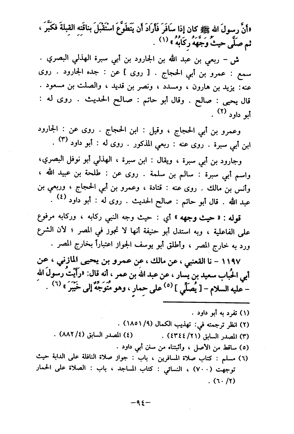 وعمرو بن أبي الحجاج، وقيل: ابن الحجاج. روى عن: الجارود ابن أبي سبرة. روى عنه: ربعي المذكور. روى له: أبو داود (3) . وجارود بن أبي سبرة، ويقال: ابن سبرة، الهذلي أبو نوفل البصري، واسم أبي سبرة: سالم بن سلمة. روى عن: طلحة بن عبيد الله، وأنس بن مالك. روى عنه: قتادة، وعمرو بن أبي الحجاج، وربعي بن عبد الله. قال أبو حاتم: صالح الحديث. روى له: أبو داود (4) . قوله: " حيث وجهه " أي: حيث وجه النبي ركابه، وركابه مرفوع على الفاعلية، وبه استدل أبو حنيفة أنها لا تجوز في المصر , لأن الشرع ورد به خارج المصر، وأطلق أبو يوسف الجواز اعتبارا بخارج المصر.