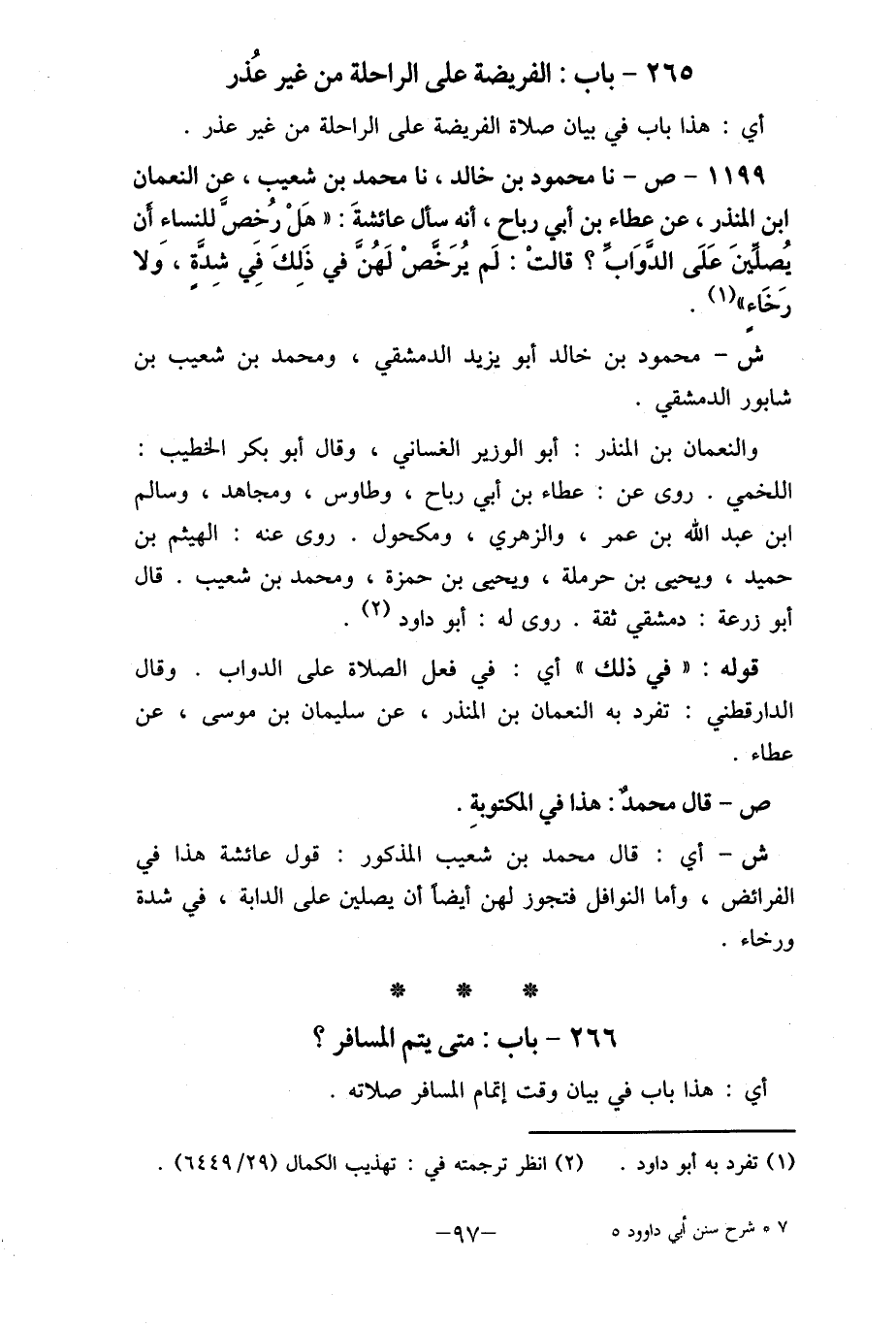 1199- ص- نا محمود بن خالد، نا محمد بن شعيب، عن النعمان ابن المنذر، عن عطاء بن أبي رباح، أنه سأل عائشةَ: " هَلْ رُخِص للنساء أن يُصلينَ عَلَى الدَوَاب"؟ قالتْ: لَم يُرَخصْ لَهُنَّ في ذَلكَ فِي شدَّة، وَلا رَخَاءٍ لما (1) .ًً ش- محمود بن خالد أبو يزيد الدمشقي، ومحمد بن شعيب بن شابور الدمشقي.