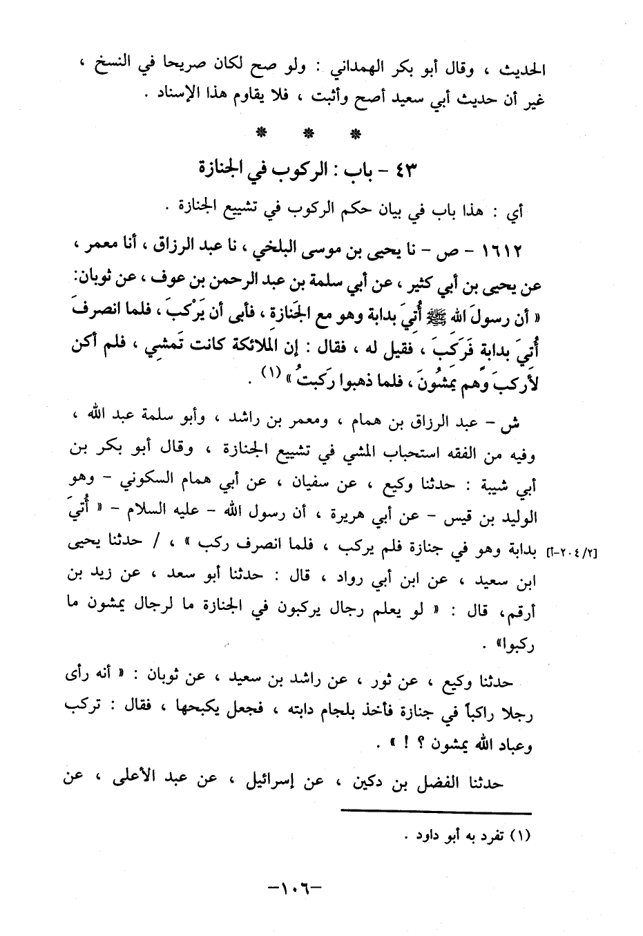 حدثنا وكيع، عن ثور، عن راشد بن سعيد، عن ثوبان: "أنه رأى رجلا راكبا في جنازة فأخذ بلجام دابته، فجعل يكبحها، فقال: تركب وعباد الله يمشون؟! ".