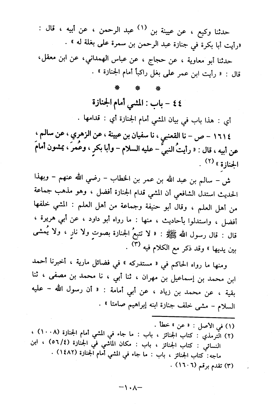 (2) الترمذي: كتاب الجنائز، باب: ما جاء في المشي أمام الجنازة (1008) ، النسائي: كتاب الجنائز، باب: مكان الماشي في الجنازة (4/ 56) ، ابن ماجه: كتاب الجنائز، باب: ما جاه في المشي أمام الجنازة (1482) .