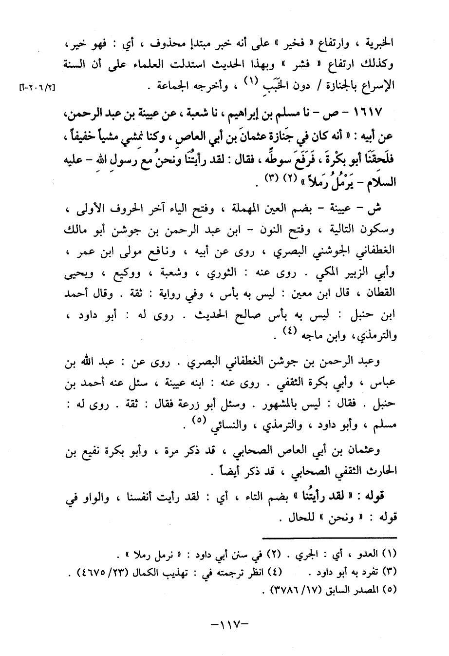 1617- ص- نا مسلم بن إبراهيم، نا شعبة، عن عيينة بن عبد الرحمن، عن أبيه: " أنه كان في جَنازة عثمانَ بن أبي العاصِ، وكنا نمِشي مشنا خفيفاً فلَحقَنَا أبو بكْرةَ، فَرَفَعَ سوطًه، فقال: لقد رأيتُنَا ونحنُ مع رسول الله- عليه السلَام- يَرْمُلُ رَملاَ " (2) (3) .