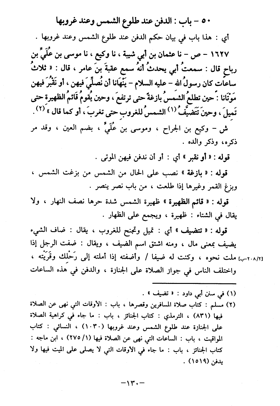 1627- ص- نا عثمان بن أبي شيبة، نا وكيعِ، نا موسى بن عُلَيِّ بين رباحٍ قال: سمعتُ أبي يحدثُ أنهُ سمع عقبةَ بن عامر، قال: "ثلاث ساعات كان رسولُ الله- عليه السلام- يَنْهَانا أن نُصلِّيَ فيهن، أو نَقْبُرَ فيهن مَوْتَانا: حين تطلعُ الشَمسُ بازغةً حتى ترتفعَ، وحن يُقومُ قَائمُ الظهيرة حتى تَمِيلَ، وحين تَتَضيفُ (1) الشمسُ للغروبِ حتى تغربَ، أو كما قال " (2) . ش- وكيع بن الجراح، وموسى بن عُلَي، بضم العين، وقد مر ذكره، وذكر والده.