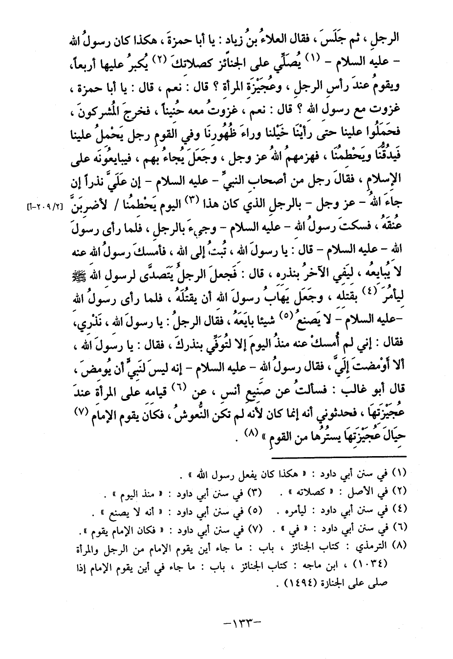 (8) الترمذي: كتاب الجنائز، باب: ما جاء أين يقوم الإمام من الرجل والمرأة (1034) ، ابن ماجه: كتاب الجنائز، باب: ما جاء في أين يقوم الإمام إذا صلى على الجنازة (1494) .