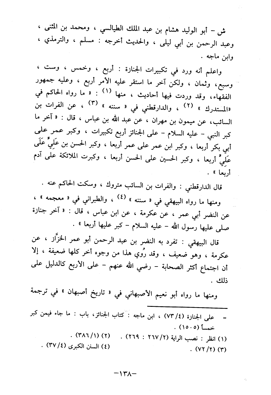 قال البيهقي: تفرد به النضر بن عبد الرحمن أبو عمر الخراز، عن عكرمة، وهو ضعيف، وقد رُوي هذا من وجوه أخر كلها ضعيفة، إلا أن اجتماع أكثر الصحابة- رضي الله عنهم- على الأربع كالدليل على ذلك.