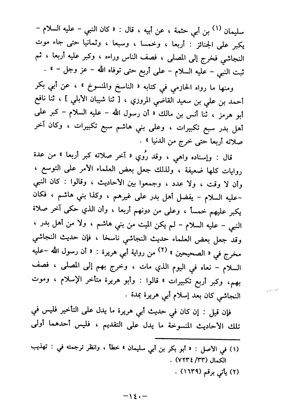 قال: وإسناده واهي، وقد رُوي " آخر صلاته كبر أربعا" من عدة روايات كلها ضعيفة، ولذلك جعل بعض العلماء الأمر على التوسع، وأن لا وقت، ولا عدد، وجمعوا بين الأحاديث، وقالوا: كان النبي - عليه السلام- يفضل أهل بدر على غيرهم، وكذا بني هاشم، فكان يكبر عليهم خمساً وعلى من دونهم أربعا، وأن الذي حكى آخر صلاة النبي- عليه السلام- لم يكن الميت من بني هاشم، ولا من أهل بدر، وقد جعل بعض العلماء حديث النجاشي ناسخا، فإن حديث النجاشي مخرج في " الصحيحين " (2) من رواية أبي هريرة: " أن رسول الله- عليه السلام- نعاه في اليوم الذي مات، وخرج بهم إلى المصلى، فصف بهم، وكبر أربع تكبيرات " قالوا: وأبو هريرة متأخر الإسلام، وموت النجاشي كان بعد إسلام أبي هريرة بمدة.