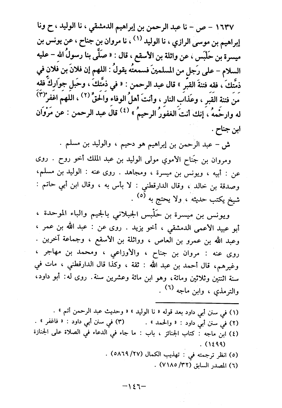 1637- ص- نا عبد الرحمن بن إبراهيم الدمشقي، نا الوليد، ح ونا إبراهيم بن موسى الرازي، نا الوليد (1) ، نا مروان بن جناح، عن يونس بن ميسرة بن حَلبَس، عن وائلة بن الأسقع، قال: " صلى بنا رسولُ الله- عليه السلام- على رَجلٍ من المسلمينَ فسمعتُه يقولُ: اللهم إن فلانَ بن فَلان في ذمَّتِكَ، فقه فتنةَ القبرِ " قال عبد الرحمن: " في ذمَّتكَ، وحَبلِ جِوَارِكَ فقه من فتنة الَقبَرِ، وعَذاب النارِ، وأنتَ أهلُ الوفاء وَالَحقِّ (2) ، اللهم اغفرْ (3) له وارحمهُ، إنك أنتم الغفورُ الرحيمُ " (4) قالَ عبد الرحمن: عن مَرْوَان ابن جناح.