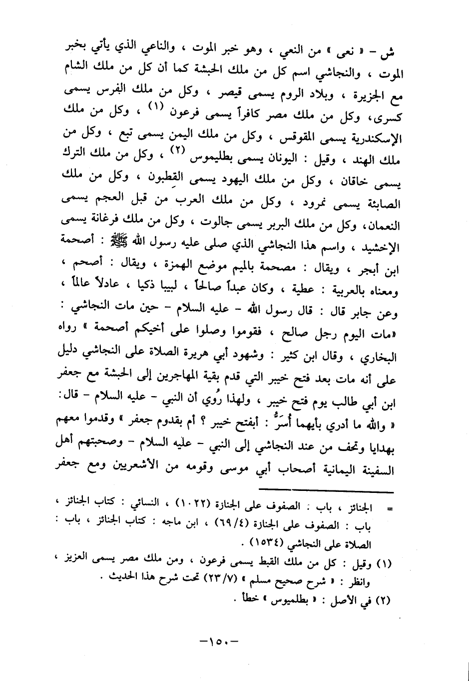 ش-" نعى" من النعي، وهو خبر الموت، والناعي الذي يأتي بخبر الموت، والنجاشي اسم كل من ملك الحبشة كما أن كل من ملك الشام مع الجزيرة، وبلاد الروم يسمى قيصر، وكل من ملك الفرس يسمى كسرى، وكل من ملك مصر كافرا يسمى فرعون (1) ، وكل من ملك الإسكندرية يسمى المقوقس، وكل من ملك اليمن يسمى تبع، وكل من ملك الهند، وقيل: اليونان يسمى بطليموس (2) ، وكل من ملك الترك يسمى خاقان، وكل من ملك اليهود يسمى القِطبون، وكل من ملك الصابئة يسمى نمرود، وكل من ملك العرب من قبل العجم يسمى النعمان، وكل من ملك البربر يسمى جالوت، وكل من ملك فرغانة يسمى الإخشيد، واسم هذا النجاشي الذي صلى عليه رسول الله صلى الله عليه وسلم: أصحمة ابن أبجر، ويقال: مصحمة بالميم موضع الهمزة، ويقال: أصحم، ومعناه بالعربية: عطية، وكان عبدا صالحاً لبيبا ذكيا، عادلا عالماً وعن جابر قال: قال رسول الله- عليه السلام- حين مات النجاشي: "مات اليوم رجل صالح، فقوموا وصلوا على أخيكم أصحمة" رواه البخاري، وقال ابن كثير: وشهود أبي هريرة الصلاة على النجاشي دليل على أنه مات بعد فتح خيبر التي قدم بقية المهاجرين إلى الحبشة مع جعفر ابن أبي طالب يوم فتح خيبر، ولهذا رُوي أن النبي- عليه السلام- قال:
