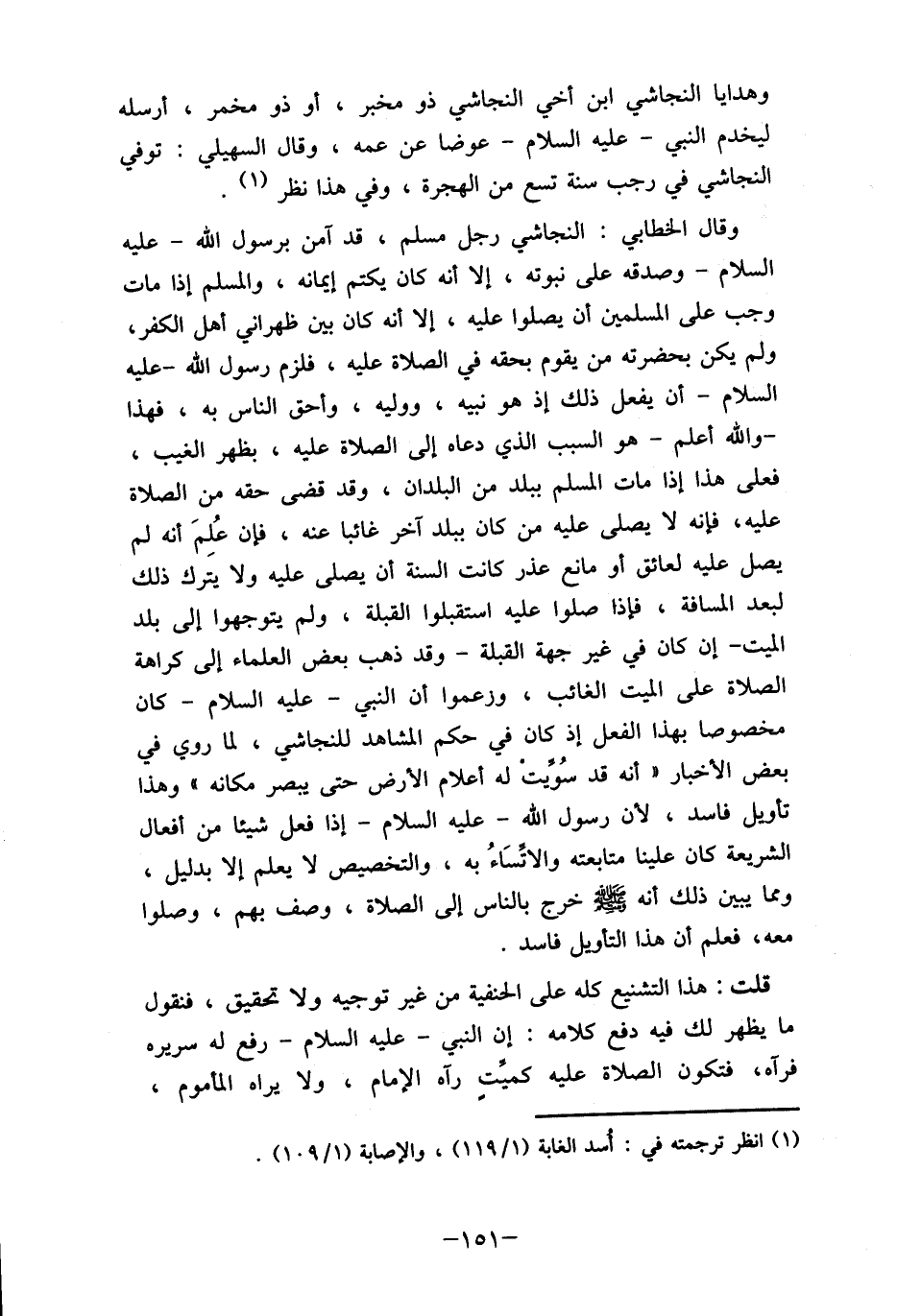 وقال الخطابي: النجاشي رجل مسلم، قد آمن برسول الله- عليه السلام- وصدقه على نبوته، إلا أنه كان يكتم إيمانه، والمسلم إذا مات وجب على المسلمين أن يصلوا عليه، إلا أنه كان بين ظهراني أهل الكفر، ولم يكن بحضرته من يقوم بحقه في الصلاة عليه، فلزم رسول الله- عليه السلام- أن يفعل ذلك إذ هو نبيه، ووليه، وأحق الناس به، فهذا - والله أعلم- هو السبب الذي دعاه إلى الصلاة عليه، بظهر الغيب، فعلى هذا إذا مات المسلم ببلد من البلدان، وقد قضى حقه من الصلاة عليه، فإنه لا يصلى عليه من كان ببلد آخر غائبا عنه، فإن عُلِمَ أنه لم يصل عليه لعائق أو مانع عذر كانت السنة أن يصلى عليه ولا يترك ذلك لبعد المسافة، فإذا صلوا عليه استقبلوا القبلة، ولم يتوجهوا إلى بلد الميت- إن كان في غير جهة القبلة- وقد ذهب بعض العلماء إلى كراهة الصلاة على الميت الغائب، وزعموا أن النبي- عليه السلام- كان مخصوصا بهذا الفعل إذ كان في حكم المشاهد للنجاشي، لما روي في بعض الأخبار " أنه قد سُويت له أعلام الأرض حتى يبصر مكانه " وهذا تأويل فاسد، لأن رسول الله- عليه السلام- إذا فعل شيئا من أفعال الشريعة كان علينا متابعته والاتسَاء به، والتخصيص لا يعلم إلا بدليل، ومما يبين ذلك أنه صلى الله عليه وسلم خرج بالناس إلى الصلاة، وصف بهم، وصلوا معه، فعلم أن هذا التأويل فاسد.