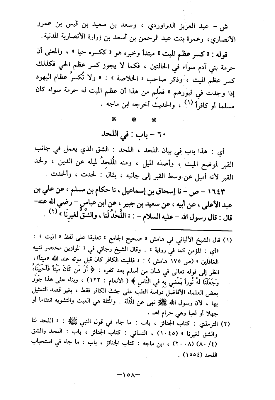 ش- عبد العزيز الدراوردي، وسعد بن سعيد بن قيس بن عمرو الأنصاري، وعمرة بنت عبد الرحمن بن أسعد بن زرارة الأنصارية المدنية. قوله: "كسر عظم الميت " مبتدأ وخبره هو "ككسره حيا "، والمعنى أن حرمة بني آدم سواء في الحالتين، فكما لا يجور كسر عظم الحي فكذلك كسر عظم الميت،. وذكر صاحب "الخلاصة": " ولا تكسرُ عظام اليهود إذا وجدت في قبورهم " فعُلِم من هذا أن عظم الميت له حرمة سواء كان مسلما أو كافرا (1) ، والحديث أخرجه ابن ماجه.