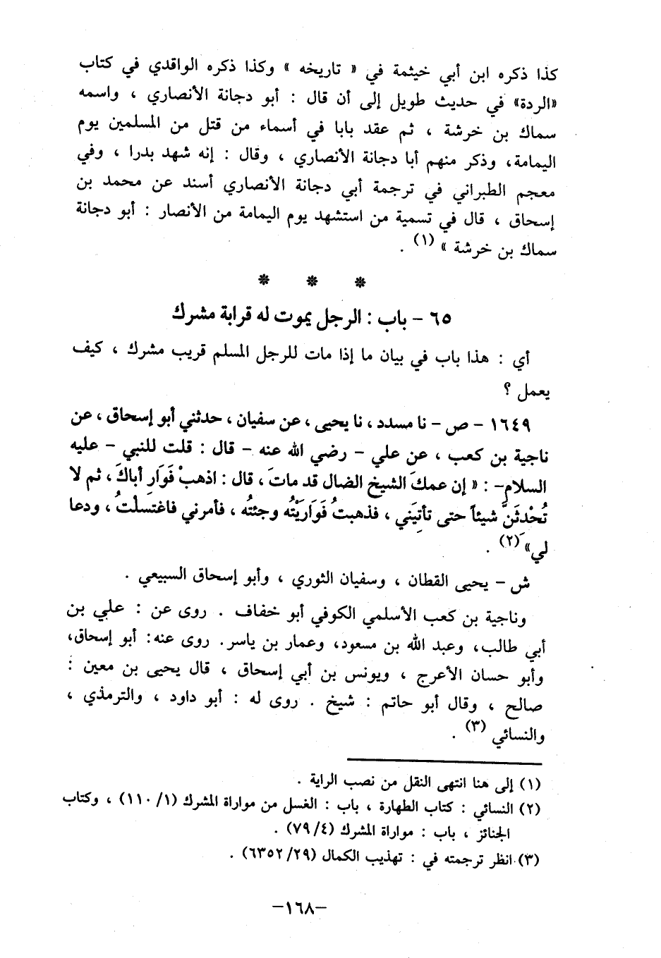 1649- ص- نا مسدد، نا يحيى، عن سفيان، حدثني أبو إسحاق، عن ناجية بن كعب، عن علي- رضي الله عنه- قال: قلت للنبي- عليه السلام -: "إن عمكَ الشيخ الضال قد ماتَ، قال: اذهبْ فَوَارِ أباكَ، ثم لا تُحْدثَن شيئا حتى تأتيَني، فذهبتُ فَوَارَيْتُه وجئتُه، فأمرني فاغتسَلتُ، ودعا لي " (2) .