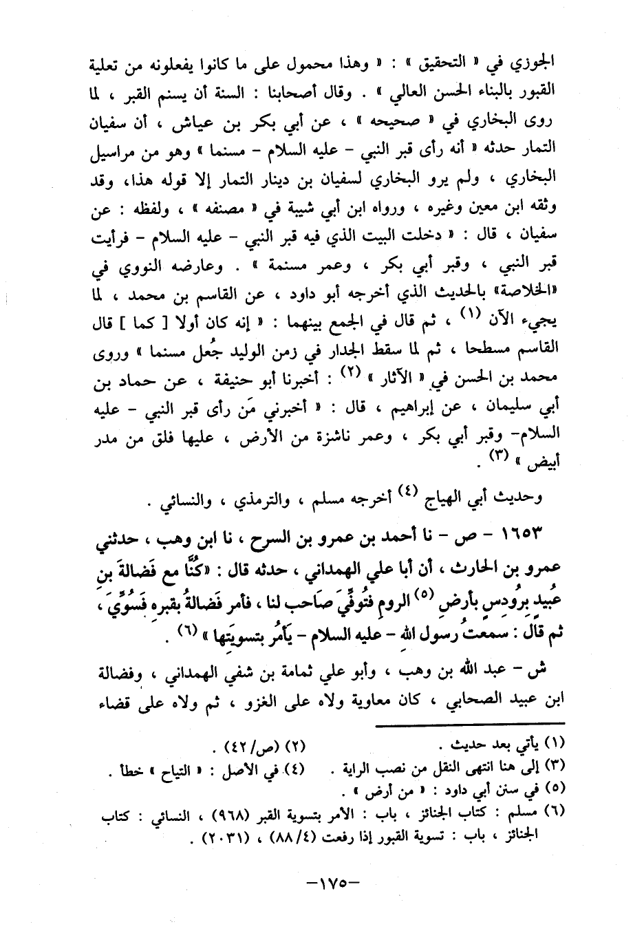 1653- عن- نا أحمد بن عمرو بن السرح، نا ابن وهب، حدثنا عمرو بن الحارث، أن أبا علي الهمداني، حدثه قال: "كنا مع فَضالةَ بنِ عُبيد بِرُودسِ بأرضِ (5) الروم فتُوفيَ صاحب لنا، فأمر فَضالةُ بقبره فسوي، ثم قال: سمعتُ رسول اللهِ- عليه السلام- يأمُر بتسويَتِها" (6) .