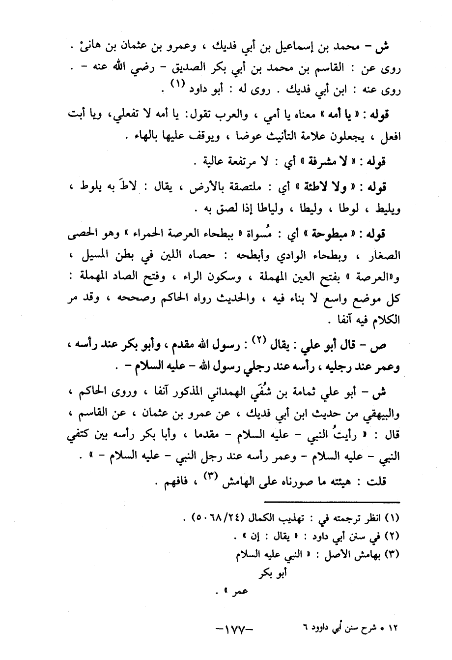 ش- أبو علي ثمامة بن شُفَي الهمداني المذكور آنفا، وروى الحاكم، والبيهقي من حديث ابن أبي فديك، عن عمرو بن عثمان، عن القاسم، قال: "رأيتُ النبي- عليه السلام- مقدما، وأبا بكر رأسه بين كتفي النبي- عليه السلام- وعمر رأسه عند رجل النبي- عليه السلام- ". قلت: هيئته ما صورناه على الهامش (3) ، فافهم.