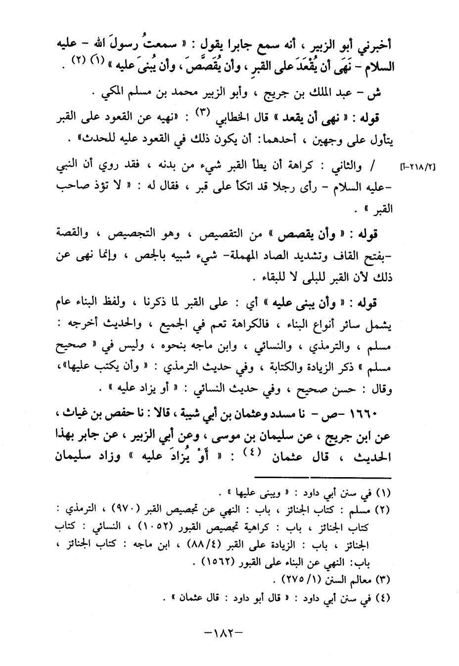 (2) مسلم: كتاب الجنائز، باب: النهي عن تجصيص القبر (970) ، الترمذي: كتاب الجنائز، باب: كراهية تجصيص القبور (1052) ، النسائي: كتاب الجنائز، باب: الزيادة على القبر (4/ مه) ، ابن ماجه: كتاب الجنائز، باب: النهي عن البناء على القبور (1562) .