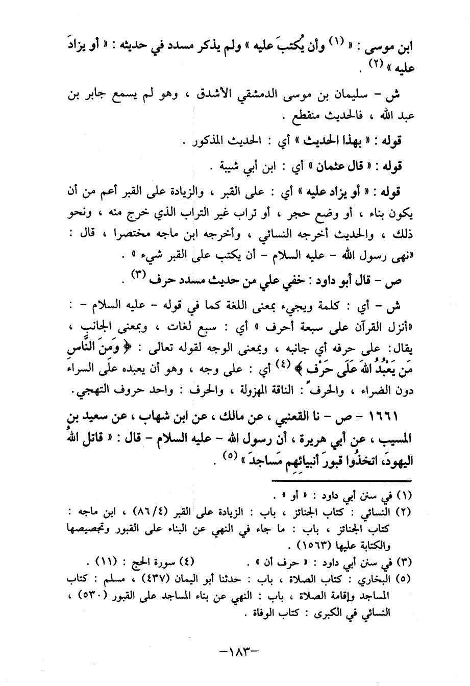 ابن موسى: " (1) وأن يُكتبَ عليه" ولم يذكر مسدد في حديثه: " أو يزادَ عليه " (2) .