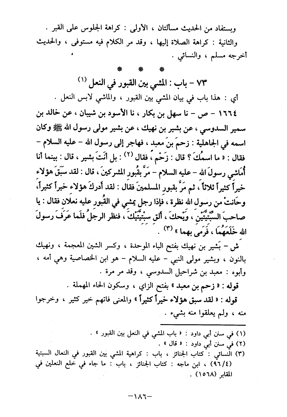 (3) النسائي: كتاب الجنائز، باب: كراهية المشي بين القبور في النعال السبتية (96/4) ، ابن ماجه: كتاب الجنائز، باب: ما جاء في خلع النعلين في المقابر (1568) .