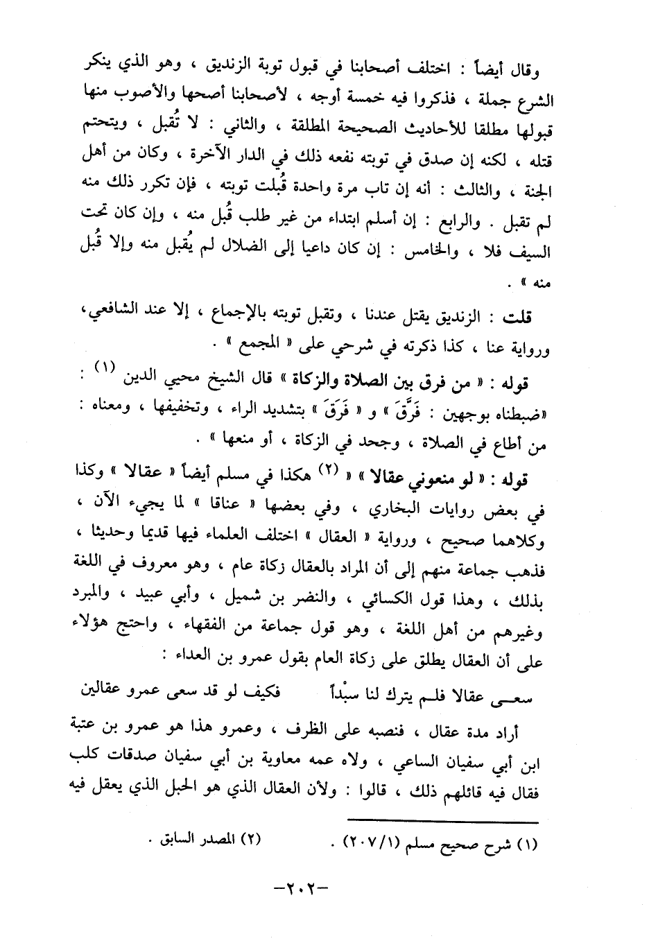 وقال أيضاً اختلف أصحابنا في قبول توبة الزنديق، وهو الذي ينكر الشرع جملة، فذكروا فيه خمسة أوجه، لأصحابنا أنصحها والأصوب منها قبولها مطلقا للأحاديث الصحيحة المطلقة، والثاني: لا تُقبل، ويتحتم قتله، لكنه إن صدق في توبته نفعه ذلك في الدار الآخرة، وكان من أهل الجنة، والثالث: أنه إن تاب مرة واحدة قُبلت توبته، فان تكرر ذلك منه لم تقبل. والرابع: إن أسلم ابتدأ من غير طلب قُبل منه، دان كان تحت السيف فلا، والخامس: إن كان داعيا إلى الضلال لم يُقبل منه وإلا قُبل قلت: الزنديق يقتل عندنا، وتقبل توبته بالإجماع، إلا عند الشافعي، ورواية عنا، كذا ذكرته في شرحي على " المجمع".