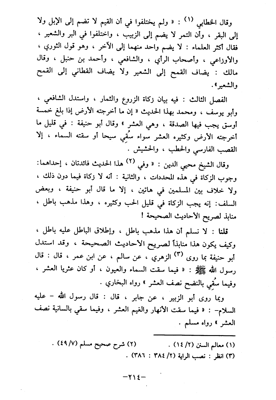 قلنا: لا نسلم أن هذا مذهب باطل، وإطلاق الباطل عليه باطل، وكيف يكون هذا منابذاً لصريح الأحاديث الصحيحة، وقد استدل أبو حنيفة بما روى (3) الزهري، عن سالم، عن ابن عمر، قال: قال رسول الله صلى الله عليه وسلم: "فيما سقت السماء والعيون، أو كان عثريا العشر، وفيما سقي بالنضح نصف العشر " رواه البخاري.