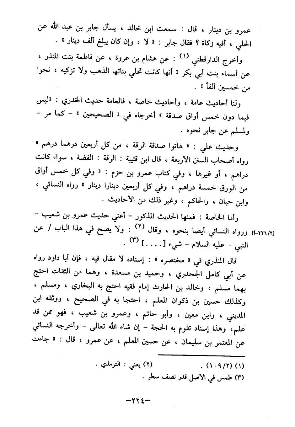 عمرو بن دينار، قال: سمعت ابن خالد، يسأل جابر بن عبد الله عن الحلي، أفيه زكاة؟ فقال جابر: " لا، وإن كان يبلغ ألف دينار". وأخرج الدارقطني (1) : عن هشام بن عروة، عن فاطمة بنت المنذر،