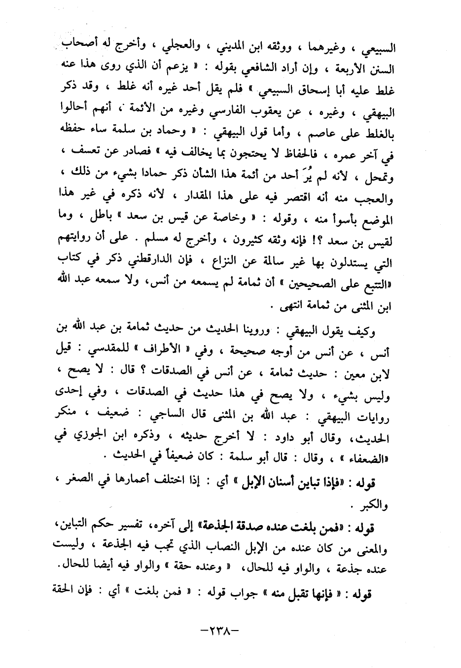 السبيعي، وغيرهما، ووثقه ابن المديني، والعجلي، وأخرج له أصحاب السنن الأربعة، وإن أراد الشافعي بقوله: "يزعم أن الذي روى هذا عنه غلط عليه أبا إسحاق السبيعي " فلم يقل أحد غيره ابنه غلط، وقد ذكر البيهقي، وغيره، عن يعقوب الفارسي وغيره من الأئمة، أنهم أحالوا بالغلط على عاصم، وأما قول البيهقي: "وحماد بن سلمه ساء حفظه في آخر عمره، فالحفاظ لا يحتجون بما يخالف فيه " فصادر عن تعسف، وتمحل، لأنه لم يُرَ أحد من أئمة هذا الشأن ذكر حمادا بشيء من ذلك، والعجب منه أنه اقتصر فيه على هذا المقدار، لأنه ذكره في غير هذا الموضع بأسوأ منه، وقوله: "وخاصة عن قيس بن سعد " باطل، وما لقيس بن سعد؟! فإنه وثقه كثيرون، وأخرج له مسلم. على أن روايتهم التي يستدلون بها غير سالمة عن النزاع، فإن الدارقطني ذكر في كتاب " التتبع على الصحيحين " أن ثمامة لم يسمعه من أنس، ولا سمعه عبد الله ابن المثنى من ثمامة انتهى.