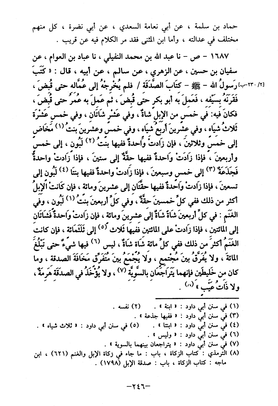 1687- ص- نا عبد الله بن محمد النفيلي، نا عباد بن العوام، عن سفيان بن حسين، عن الزهري، عن سالم، عن أبيه، قال: " كَتَبَ، رَسولُ الله صلى الله عليه وسلم كِتَابَ الصَّدَقَةِ/ فلم يُخْرِجْهُ إلى عُمَّالِه حتى قُبضَ، فَقَرَنَهُ بِسَيْفِهِ، فَعَمِلَ به أبو بكرٍ حتى قُبِضَ، ثم عَمِلَ به عُمر حتى قُبَضَ، فكانَ فيه: في خمسٍ من الإِبِلِ شاة، وفي عَشْرٍ شَاتَانِ، وفي خمسِ عَشْرَة ثَلاثُ شياه، وفي عِشرينَ أربعُ شياه، وفي خمسٍ وعشرينَ بنتُ (1) مَخَاضٍ إلى خمسٍ وثلاثينَ، فإن زَادت واحدة ففيها بنتُ (2) لَبُون، إلى خمس وأربعينَ، فإذا زَادَتْ وَاحدة ففيها حرة إلى ستينَ، فإذاً زَادتْ واحدة فَجَذَعَة (3) إلى خمسٍ وسبعينَ، فإذا زادت واحدة ففيها بنتَا (4) لَبُون إلى تسعين، فإذا زَادتْ وَاحدة ففيها حقتانِ إلى عشرينَ ومائةٍ، فإن كَانتْ لإِبِلُ أكثر من ذلك ففي كلِّ خمسينَ حقة، وفي كَلِّ أربعينَ بنتُ (1) لَبُون، وفي الغَنَم: في كلِّ أربعينَ شَاةً شَاة إلاَ عشرِينَ ومائة، فإن زَادتْ وَاحدة فَشَاتَانِ إلى المائتين، فإذا زَادتْ على المائتينِ فَفيها ثَلاث (5) أي ثَلَثَمَائةٍ، فإن كانت الغَنَمُ أكثر من ذلك ففي كلِّ مائةِ شَاةٍ شَاة، ليس (6) فيها شيء حتى تَبْلُغً المائةَ، ولا يُفَرقُ بينَ مُجْتمِعٍ، ولا يُجْمَعُ بينَ مُتَفَرِّقٍ مَخَافَةَ الصدقةِ، وما كان مِن خَلِيطَينِ فإنهما يَتَرَاجَعَانِ بالسَّوِيةِ (7) ، ولا يُؤْخَذُ في الصدَقَةِ هَرِمَة، ولا ذات عَيْبٍ " (8)