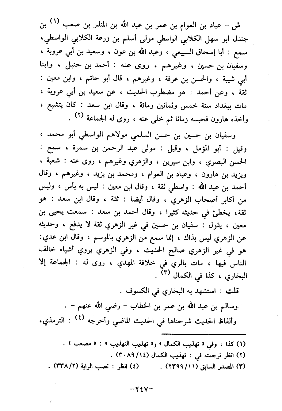 ش- عباد بن العوام بن عمر بن عبد الله بن المنذر بن صعب (1) بن جندل أبو سهل الكلابي الواسطي مولى أسلم بن زرعة الكلابي الواسطي، سمع: أبا إسحاق السبيعي، وعبد الله بن عون، وسعيد بن أبي عروبة، وسفيان بن حسين، وغيرهم، روى عنه: أحمد بن حنبل، وأبناء أبي شيبة، والحسن بن عرفة، وغيرهم، قال أبو حاتم، وابن معين: ثقة، وعن أحمد: هو مضطرب الحديث، عن سعيد بن أبي عروبة، مات ببغداد سنة خمس وثمانين ومائة، وقال ابن سعد: كان يتشيع، وأخذه هارون فحبسه زمانا ثم خلى عنه، روى له الجماعة (2) .